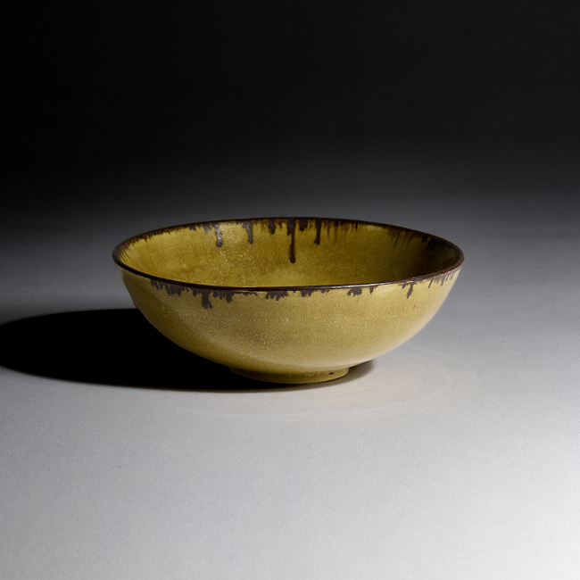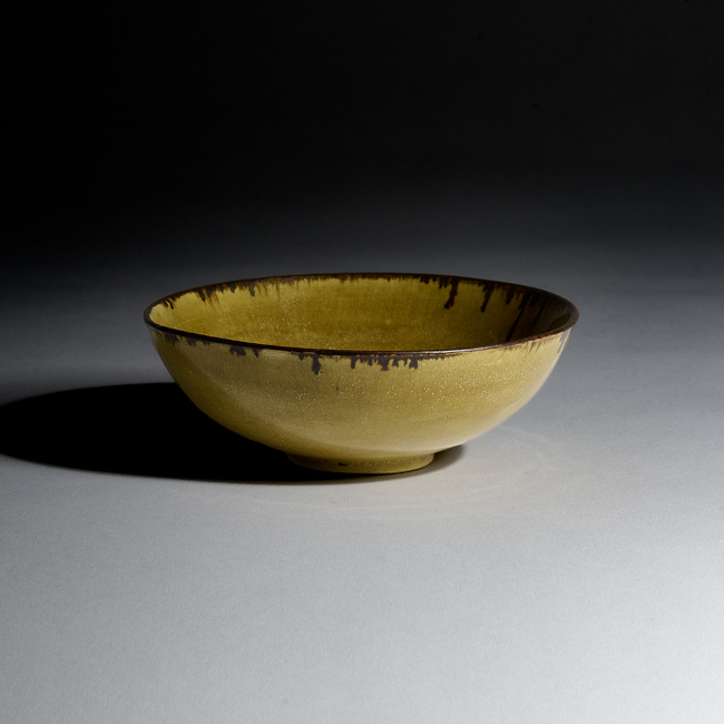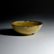 Stoneware bowl. Mustard yellow glaze with manganese dripped rim.