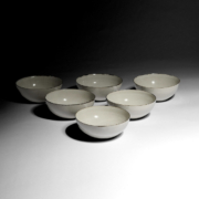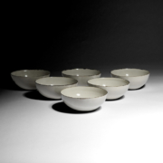 Set of six bowls 1970s Stoneware with cream glaze and feathered manganese rims. Impressed LR seal to bases. (LR37)