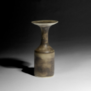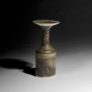 Stoneware vase C1970s. Cylindrical form with tapering to a flared rim. Spiralled striations in a green and brown glaze. Impressed LR seal to base. (LR40)