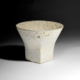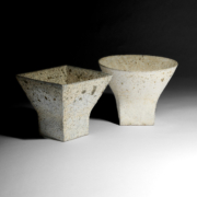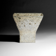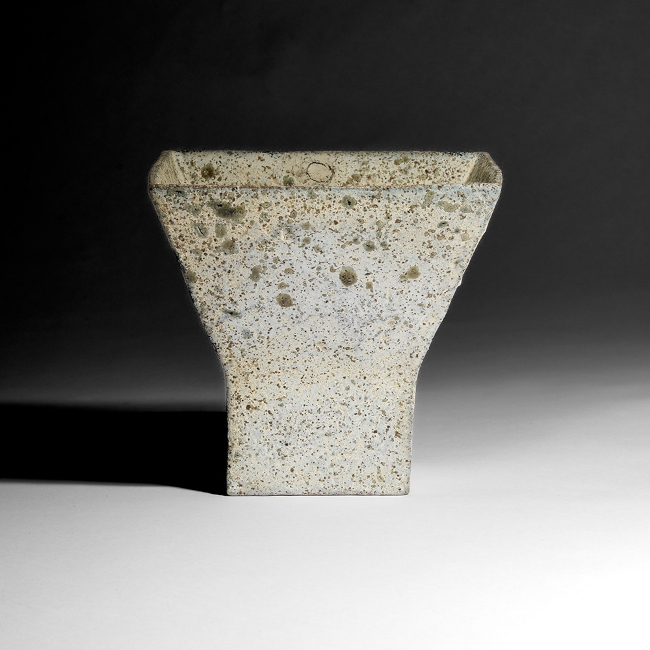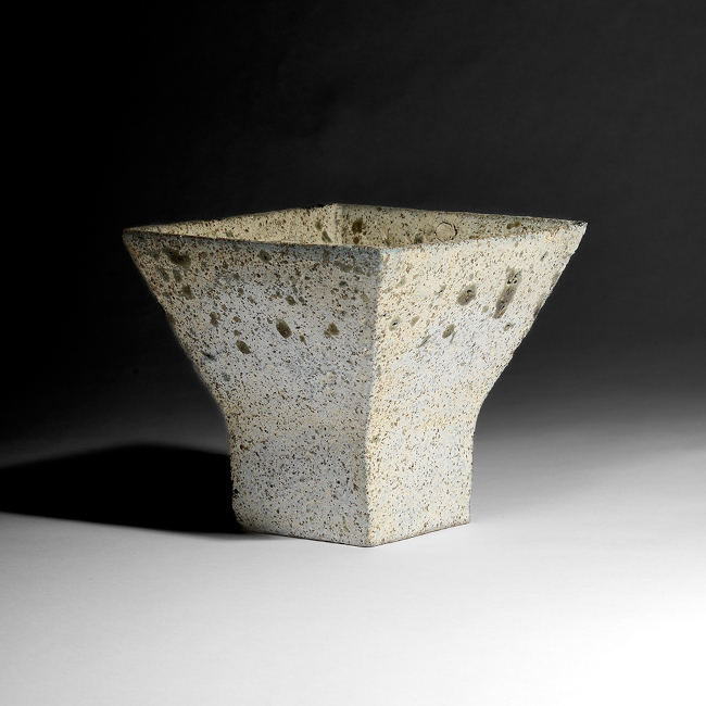 Stoneware footed bowl with squared rim. Pitted and textured cream glaze with green specks. Impressed Philp seal to foot. (PP23)
